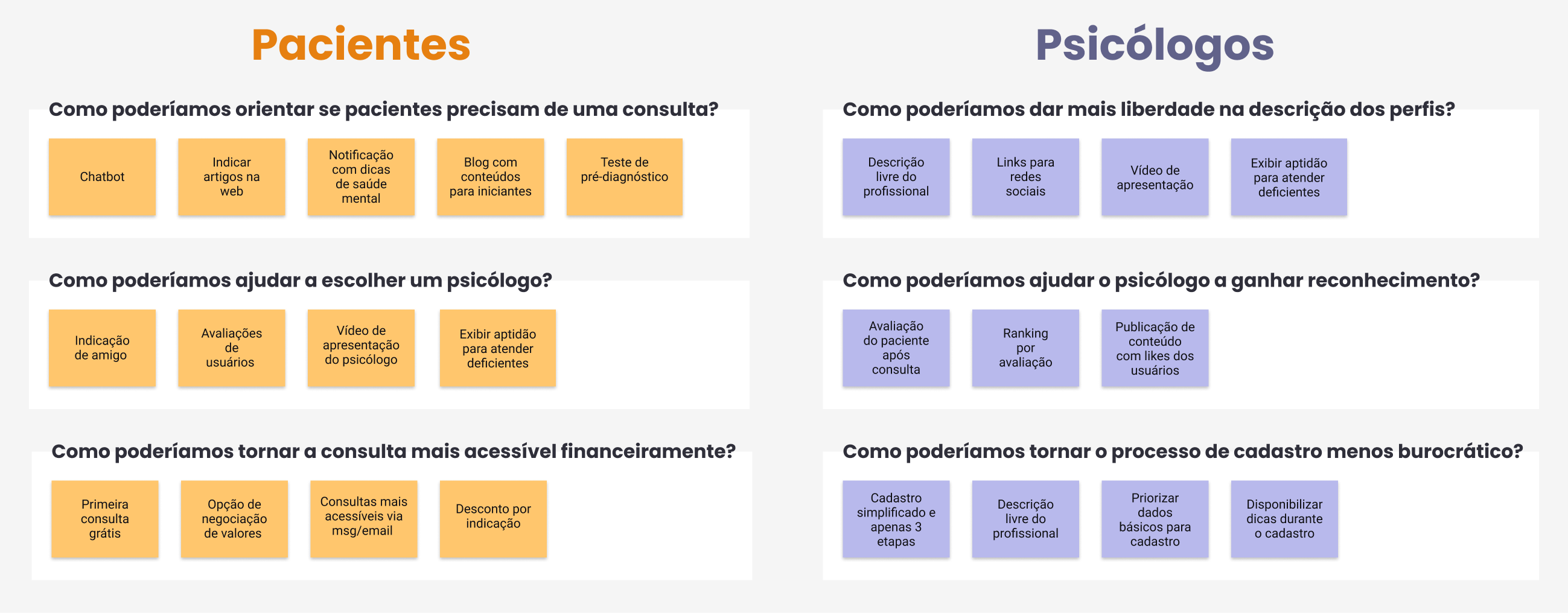 With this activity, it was possible to realize that all solutions aimed at people who have never consulted had a high effort to be developed. These solutions would be intended for only 44% of our patient audience, while solutions for financial issues would benefit 100% of the patient audience. Keeping this in mind, it was decided to prioritize solutions to the financial problem and leave solutions for people who have never consulted for a future release.