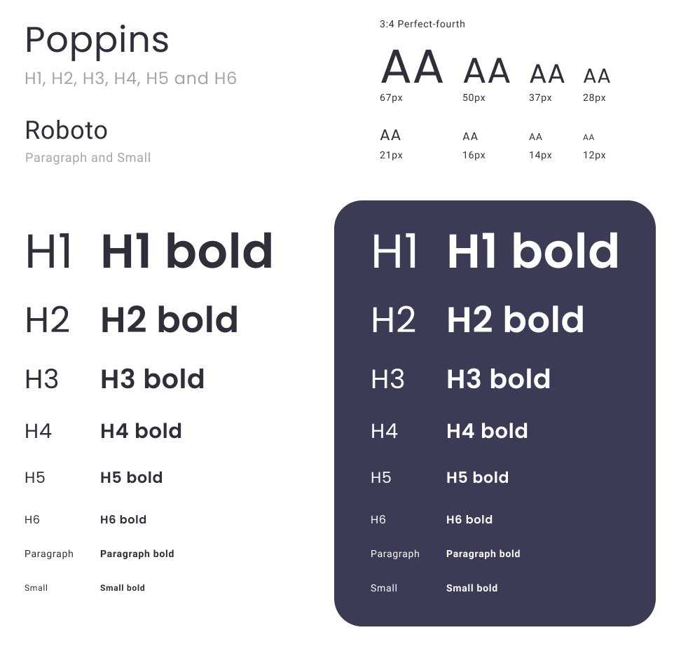 Typography: The chosen typography for titles is Poppins, as it conveys lightness through its minimalist design. For paragraphs, we used Roboto, which has a more fluid reading experience. Choosing a sans-serif font is important to allow character resizing without distortion or illegibility. The perfect fourth proportion was used to achieve balance and sobriety between the texts.