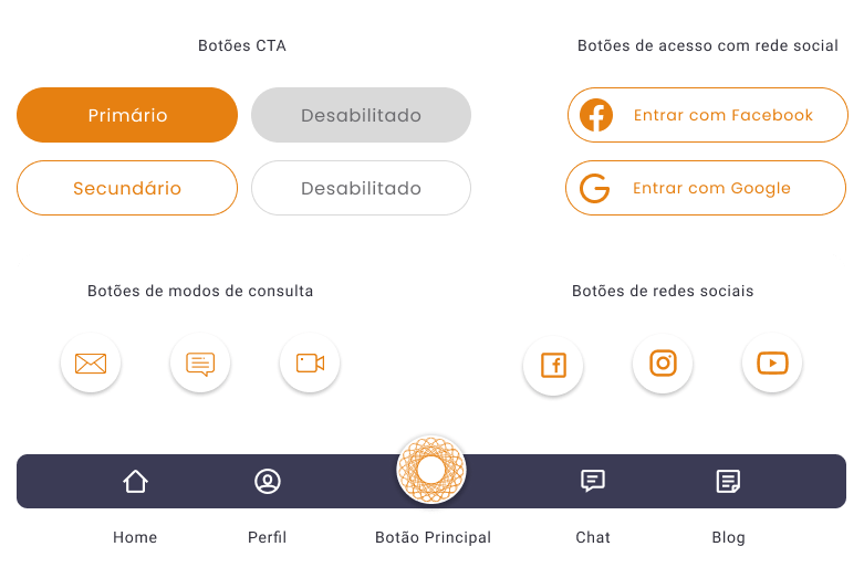 Buttons: to provide hierarchy among the buttons, a primary button was created with a solid orange fill, and a secondary button in ghost style. The buttons have rounded edges to convey lightness and modernity. Round buttons were used for social network query and upload modes. The navigation bar has 5 buttons, where the central one is the main button that features the brand logo.