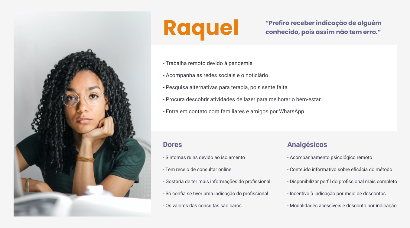 Raquel represents people who were undergoing in-person therapy, but due to the pandemic they can no longer go to the office and are looking for an alternative.