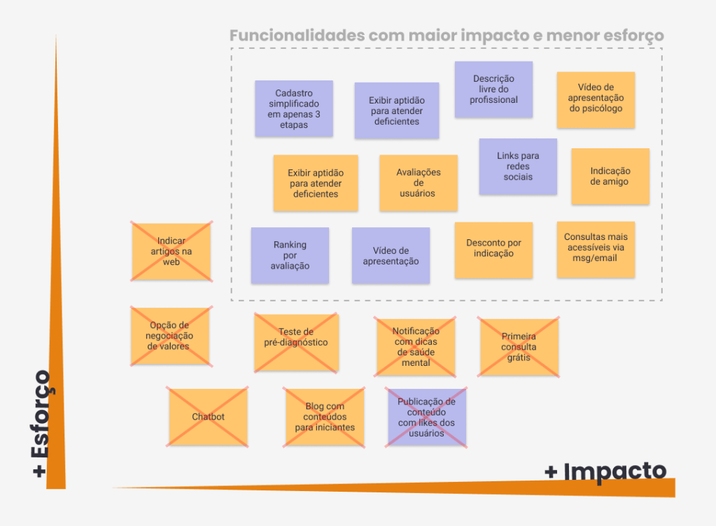 After several brainstorming features emerged, they were inserted into the Impact x Effort Matrix to visualize what would be prioritized and what would be discarded.