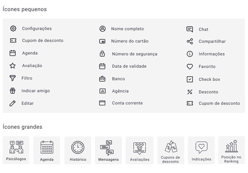 Icons: used to provide a quicker understanding for the user by associating the image of the icon with the written name. Minimalistic icons were chosen to facilitate identification and match the brand. On the home page, some buttons in the carousel format appear with larger icons. The idea is for the user to become familiar with the symbol and no longer need to read the button, making navigation smoother.